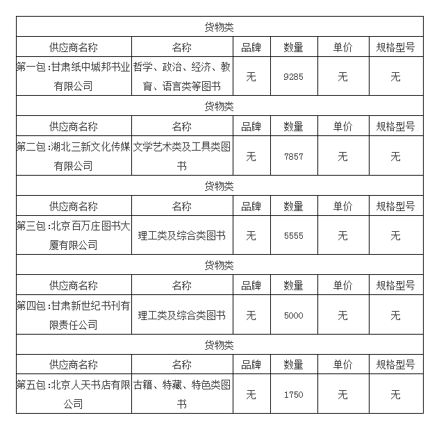 第一包:甘肃纸中城邦书业有限公司,中标折扣:60%;第二包:湖北三新文化传媒有限公司,中标折扣:61%;第三包:北京百万庄图书大厦有限公司,中标折扣:63%;第四包:甘肃新世纪书刊有限责任公司,中标折扣:62%;第五包:北京人天书店有限公司,中标折扣:65%;第六包:有效投标人不足三家,予以废标 。