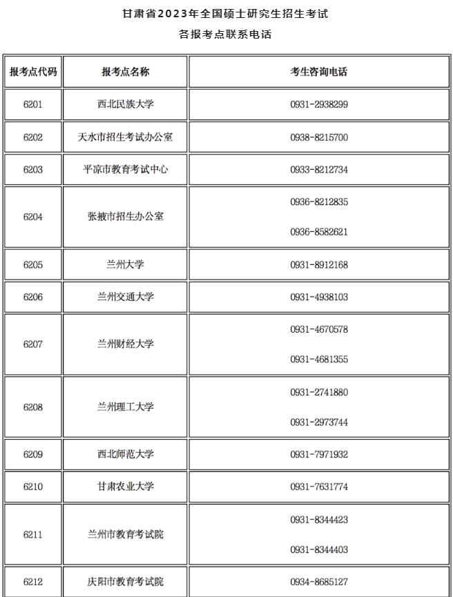 附件:甘肃省2023年全国硕士研究生招生考试各报考点联系电话