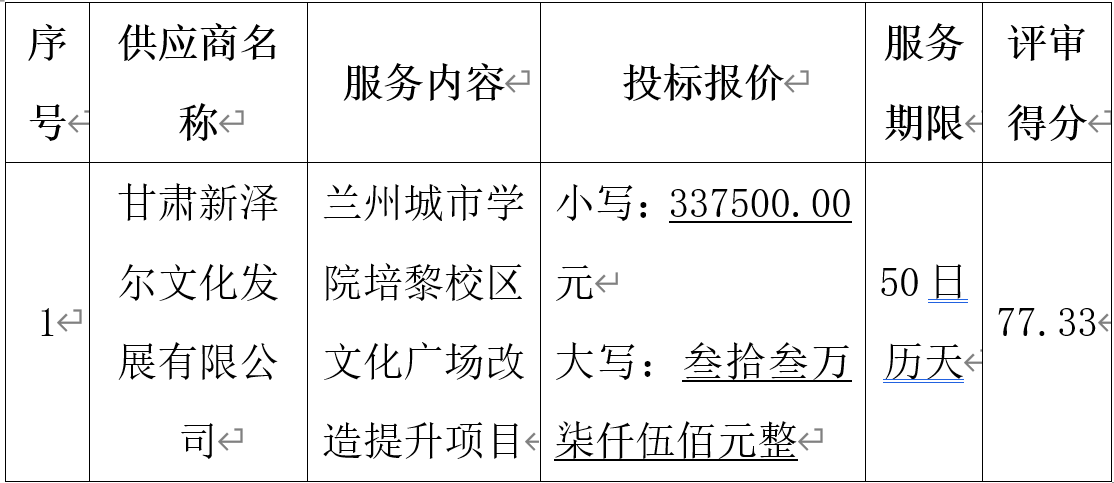 甘肃安宇工程造价咨询有限公司受beat365在线唯一官网的委托,对“beat365在线唯一官网培黎校区文化广场改造提升项目”以竞争性磋商的方式进行采购,磋商小组于2024年4月30日确定成交结果。现将成交结果公布如下: