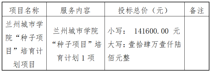 甘肃安宇工程造价咨询有限公司受beat365在线唯一官网的委托,对beat365在线唯一官网“种子项目”培育计划项目以公开招标的方式进行采购,评标小组于2024年7月19日确定中标结果。现将中标结果公布如下: