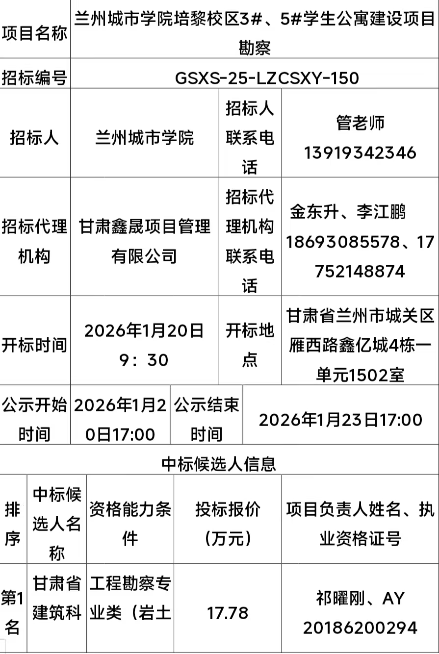 beat365在线唯一官网培黎校区3#、5#学生公寓建设项目勘查中标候选人公示