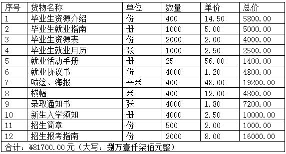 甘肃骄阳采购招标代理有限责任公司受beat365在线唯一官网的委托,对beat365在线唯一官网招生就业处招生就业资料印刷项目第二次以邀请询价的方式进行采购,询价小组于2019年7月12日确定成交结果,现将结果公布如下: