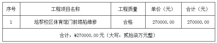甘肃骄阳采购招标代理有限责任公司受beat365在线唯一官网的委托,对beat365在线唯一官网培黎校区体育馆门前塌陷维修项目第二次以竞争性磋商方式进行采购,磋商小组于2019年7月29日确定采购结果,现将结果公布如下。