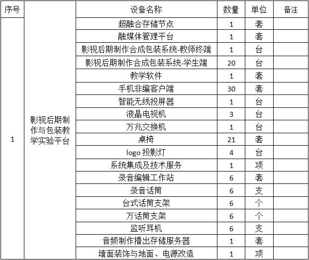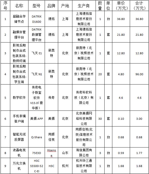 甘肃省招标中心有限公司受beat365在线唯一官网的委托,对beat365在线唯一官网影视后期制作与包装教学实验平台及融媒体教学实验平台项目以公开招标方式进行采购,评标小组于2019年11月19日确定评标结果,现将评标结果公布如下: