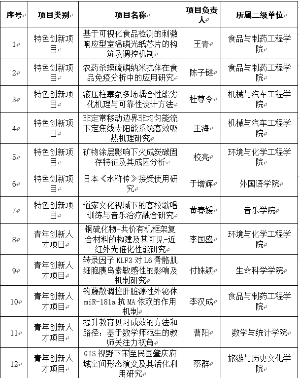 本网讯 近日,广东省教育厅公布了2023年度普通高校认定类科研项目立项名单,永利官网12个申报项目获得立项,其中,食品与制药工程学院获批3项,环境与化学工程学院、机械与汽车工程学院各获批2项,旅游与历史文化学院、生命科学学院、数学与统计学院、外国语学院、音乐学院各获批1项。