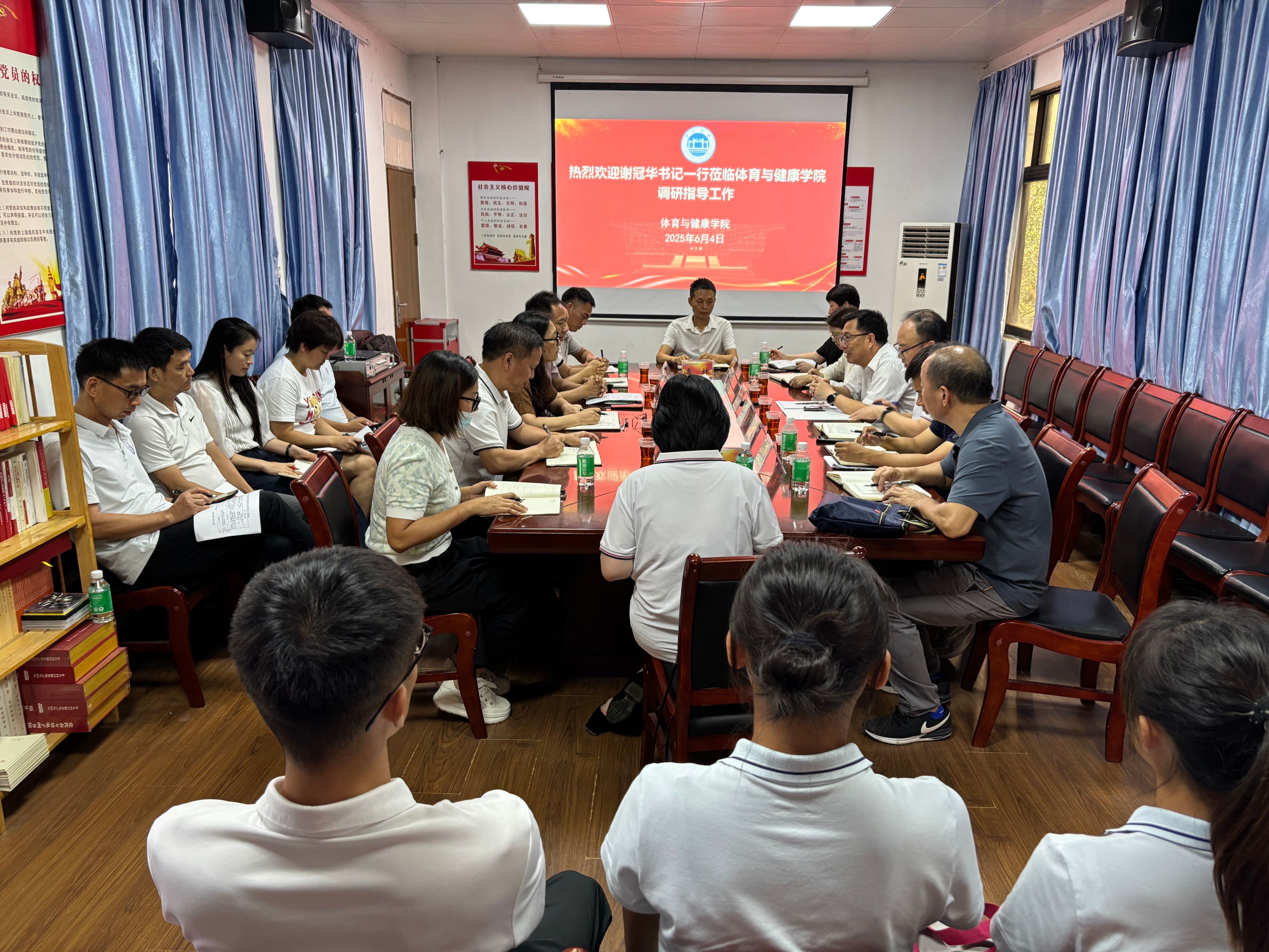 本网讯 6月4日,校党委书记谢冠华带队到体育与健康学院调研,党政办公室、宣传统战部、学生工作部、人力资源部、教务部、科学技术部、资产设备管理部、团委等相关职能部门负责人,体育与健康学院党政领导班子、各系(部)负责人以及刚刚在广东省第十二届大学生运动会上为学校取得优异成绩的教练员代表、运动员代表参加座谈。