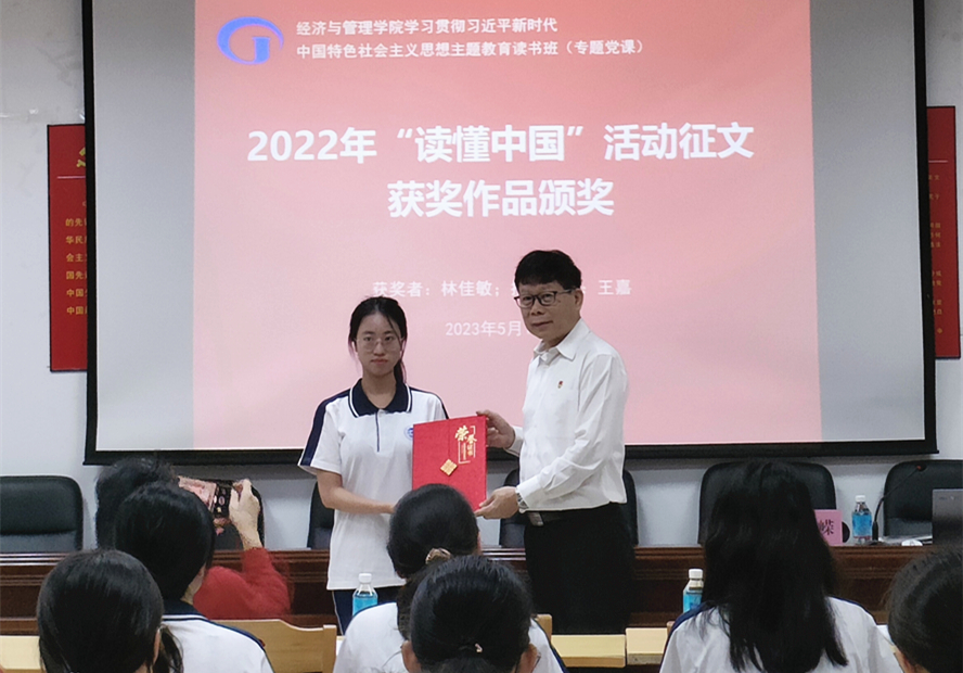 党课开始前,叶峥嵘为经管学院获得2022年“读懂中国”活动征文省级三等奖选手林佳敏同学颁奖,鼓励同学们要不断传承红色基因,从百年党史中汲取奋进前行的力量。