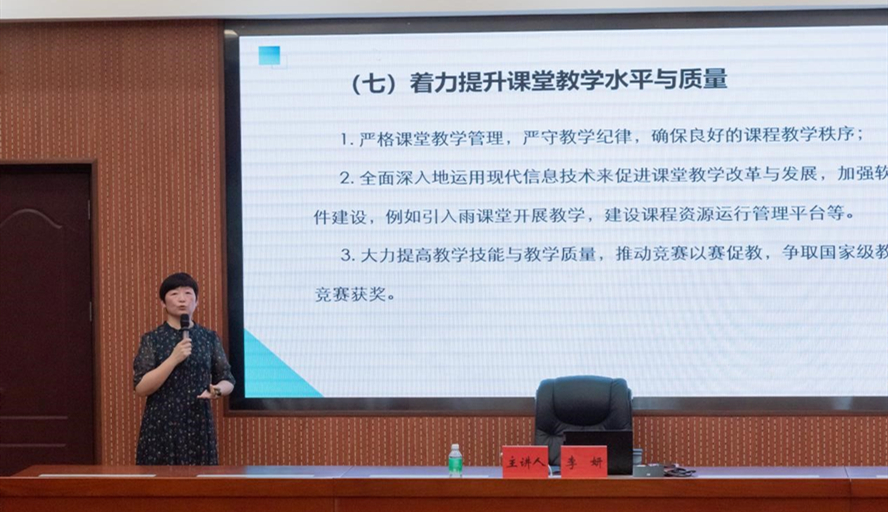 在教学专题培训会上,李妍以《永利集团3044官网欢迎您教学管理与教学改革发展情况简介》为题,详细介绍学校教学基本情况、主要教学管理制度和改革与发展方向的内容。她提出,教育的改革和发展需从七个方面不断优化,一是提升专业内涵,加强专业建设;二是以一流课程为抓手,推动课程建设;三是培育优秀教学成果;四是加强教学团队与基层教学组织建设;五是推动教学评价改革;六是实现“学生中心”理念,深化学分制改革;七是着力提升课堂教学水平与质量。她建议新教师要建立自己的学术、工作和社会体系,履行对学生学术、职业和生活的三个导向职责,做好教学的本职工作。