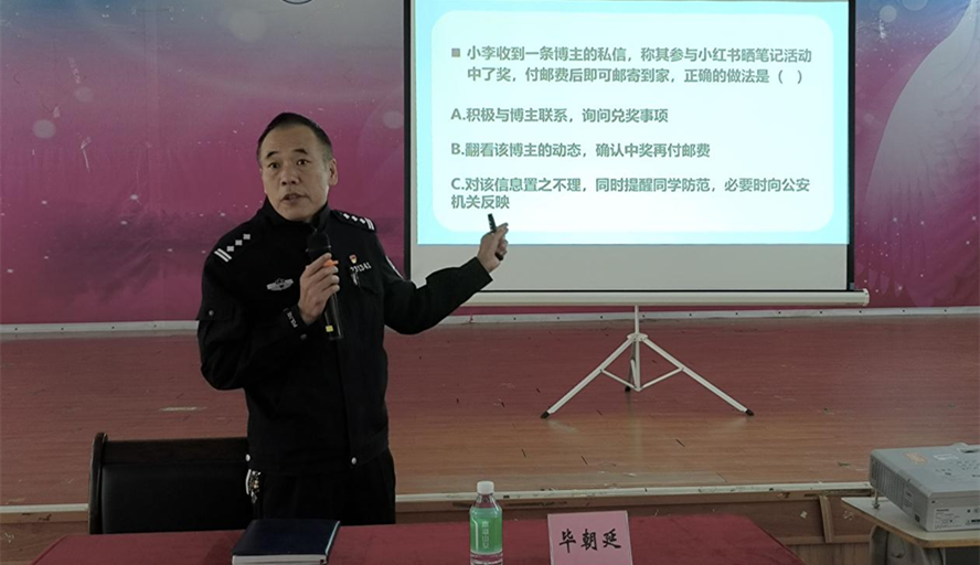 本网讯 为提高大学生的反诈意识和风险防控能力,增强同学们的自我保护意识,维护合法权益,12月1日,政法学院邀请大冲派出所所长毕朝延到星湖校区小礼堂为2023级新生开展“全民反诈,你我同行”防范电信网络诈骗宣讲会。