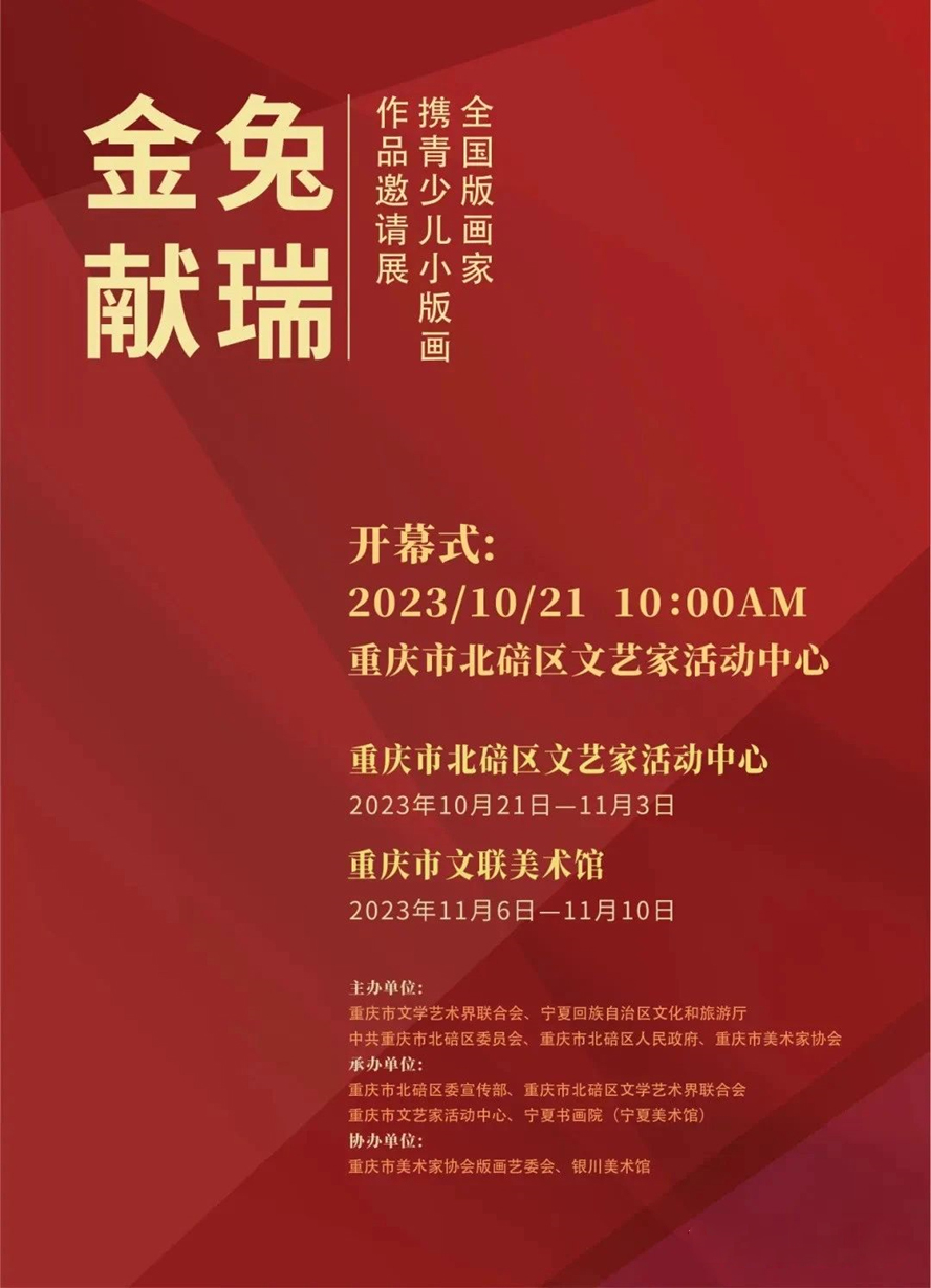 本网讯 近日,美术学院版画工作室陈志昕老师与其5名学生的6件作品获邀参加由重庆市文学艺术界联合会、宁夏回族自治区文化和旅游厅、中共重庆市北碚区委员会、重庆市北碚区人民政府、重庆市美术家协会联合主办的“金兔献瑞——全国版画家携青少儿小版画作品邀请展”,这是陈志昕老师连续第四年受邀参加该项活动。