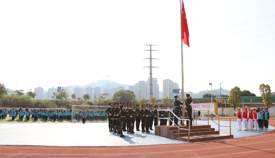国旗护卫队分别前往四会市石狗学校和四会市东城街道荔枝湾小学开展庄严的升旗仪式、微队(团)课、匕首操表演,指导属地中小学生熟练掌握升旗动作要领,并进行对话交流等活动。本次主题教育活动的开展,通过大学生的“大手”牵动四会市中小学生的“小手”,提升爱国主义教育的吸引力和实效性,锻造学生热爱祖国、矢志报国的意志品质,促进爱国主义教育与思政课一体化建设紧密融合,取得了良好效果。