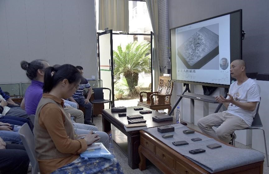 讲座结束后,伦少国和师生进行了端砚文化交流和讨论,师生们近距离接触古砚,让师生更直观更深刻地理解和感受端砚制作人的文化思想。