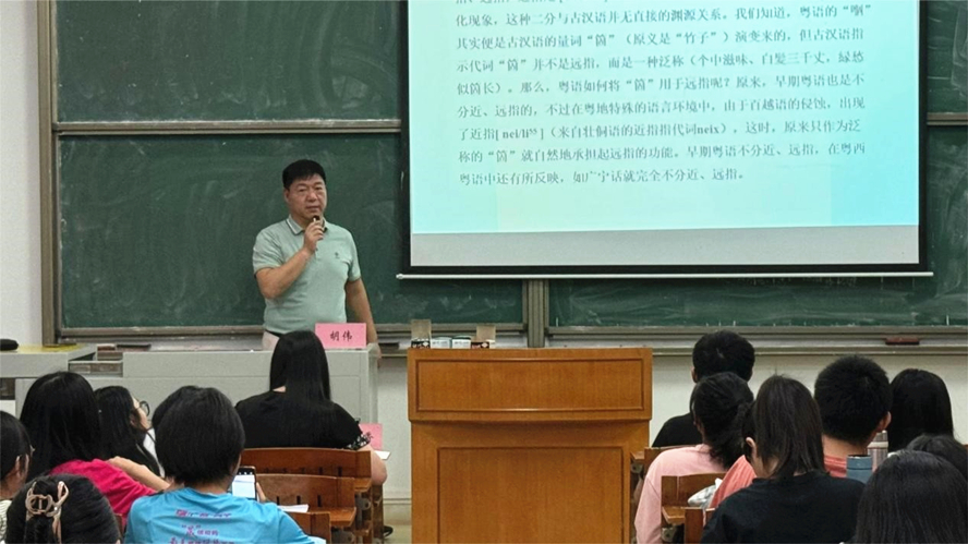 在题为《岭南方言与文化趣谈》的讲座上,胡伟分别介绍了岭南地区三种方言与文化现象。他结合网络热点及经典古诗词,讲授方言学习、文化学习的内涵,引导同学们了解跨界文化创意融合情况,表示方言文化应主动适应新媒体发展趋势,创新文化传播方式,让文化与新时代共情共生。