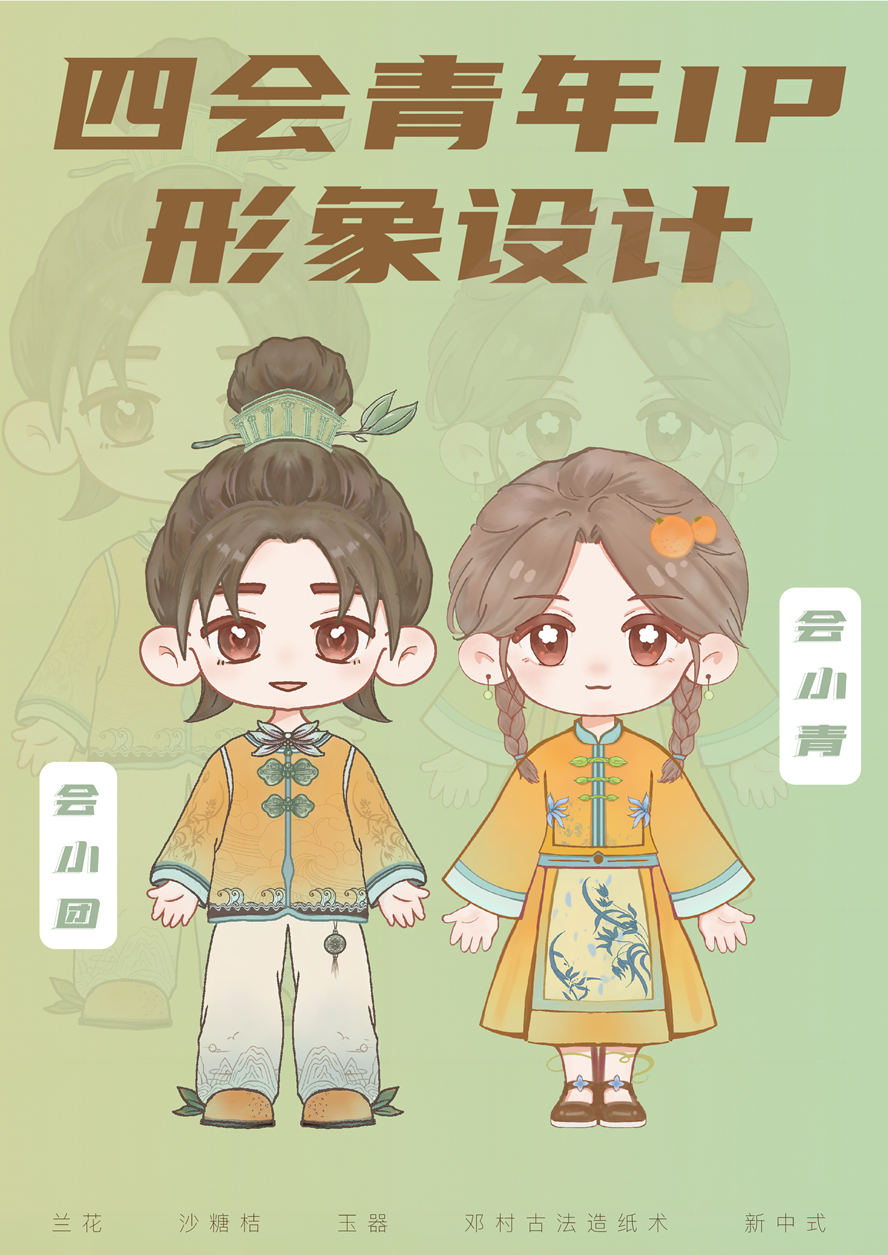 此次设计,队员们将专业知识与丰富的社会实践相结合,以四会市独特的文化为灵感源泉,将兰花、沙糖桔、玉器以及邓村古法造纸术等经典元素巧妙地融入设计之中。这不仅展现了四会作为“中国柑桔之乡”和“中国玉器之乡”的深厚底蕴,更彰显了四会青年积极向上的精神风貌和朝气蓬勃的青春活力。“会小团”和“会小青”两款IP形象,设计新颖、独具匠心,将现代审美与传统元素相融合,打造出既健康时尚又年轻活力的东方美感,为四会市的青年文化注入了新的活力。