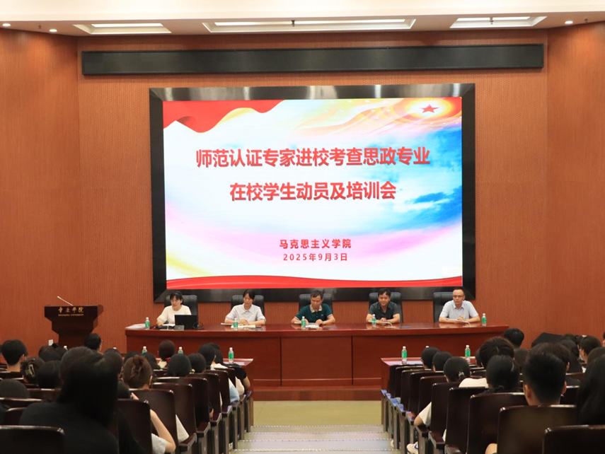 本网讯 9月3日晚,马克思主义学院在图书馆报告厅召开师范认证专家进校考查思政专业在校学生动员及培训会。学院领导班子、全体班主任、辅导员及全体思政专业在校学生参加会议。