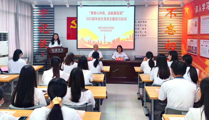 本网讯 为加强毕业生党员教育管理,进一步坚定理想信念,提高自身素质,迎接社会挑战与考验,6月23日,旅游学院在初心堂组织开展2022届毕业生党员“青春心向党,启航新征程”主题党日活动。学院党委书记杨雪梅、副书记陈军、学生党支部书记以及毕业生党员参加。