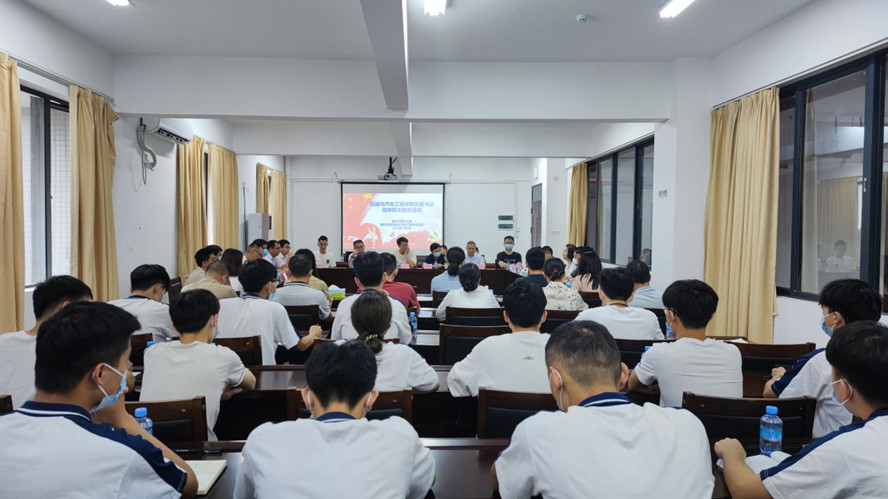 田华致欢迎辞,并介绍学院办学情况、师资队伍、学科建设、专业建设及学生创新创业等情况。李剑英就《肇庆市新能源汽车及汽车零部件产业发展及人才需求》做专题报告,勉励广大教师党员坚持“立德树人”根本任务,培养高质量人才。