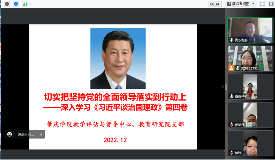 本网讯 为深入学习《习近平谈治国理政》(第四卷),进一步增强学习贯彻的思想自觉、政治自觉、行动自觉,准确把握党的新理念、新思想,评估中心、发展研究院党支部近日在线上组织开展党课,党课由党支部书记、评估中心主任李佩环主讲。