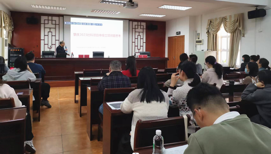 本网讯 2月23日,社科处组织召开2023年肇庆市哲学社会科学规划项目申报辅导报告会。肇庆市社会科学界联合会党组成员、二级调研员周春辉应邀作题为《肇庆2023社科项目申报立项问题思考》的专题讲座。研究生院主持工作副院长杨琰主持,学校拟申报规划项目的教师参会。