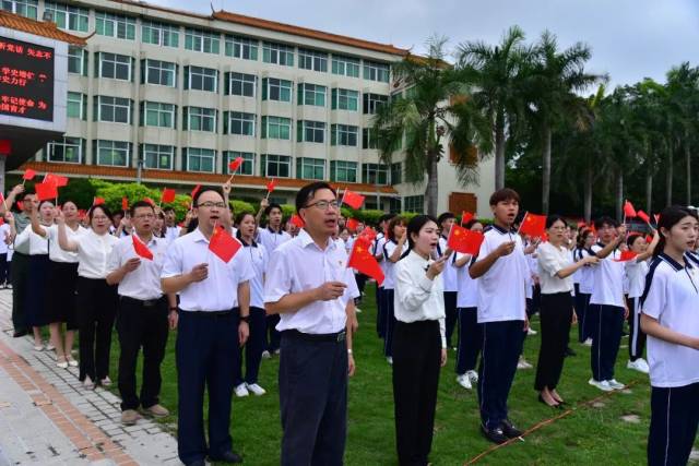 在观看庆祝大会直播前,1000名师生代表齐聚国砚广场,出席学校举行的升旗仪式。仪式中,全场师生向冉冉升起的国旗行注目礼,然后齐声唱响《没有共产党就没有新中国》,共同庆祝中国共产党百年华诞,祝福伟大的祖国繁荣富强。