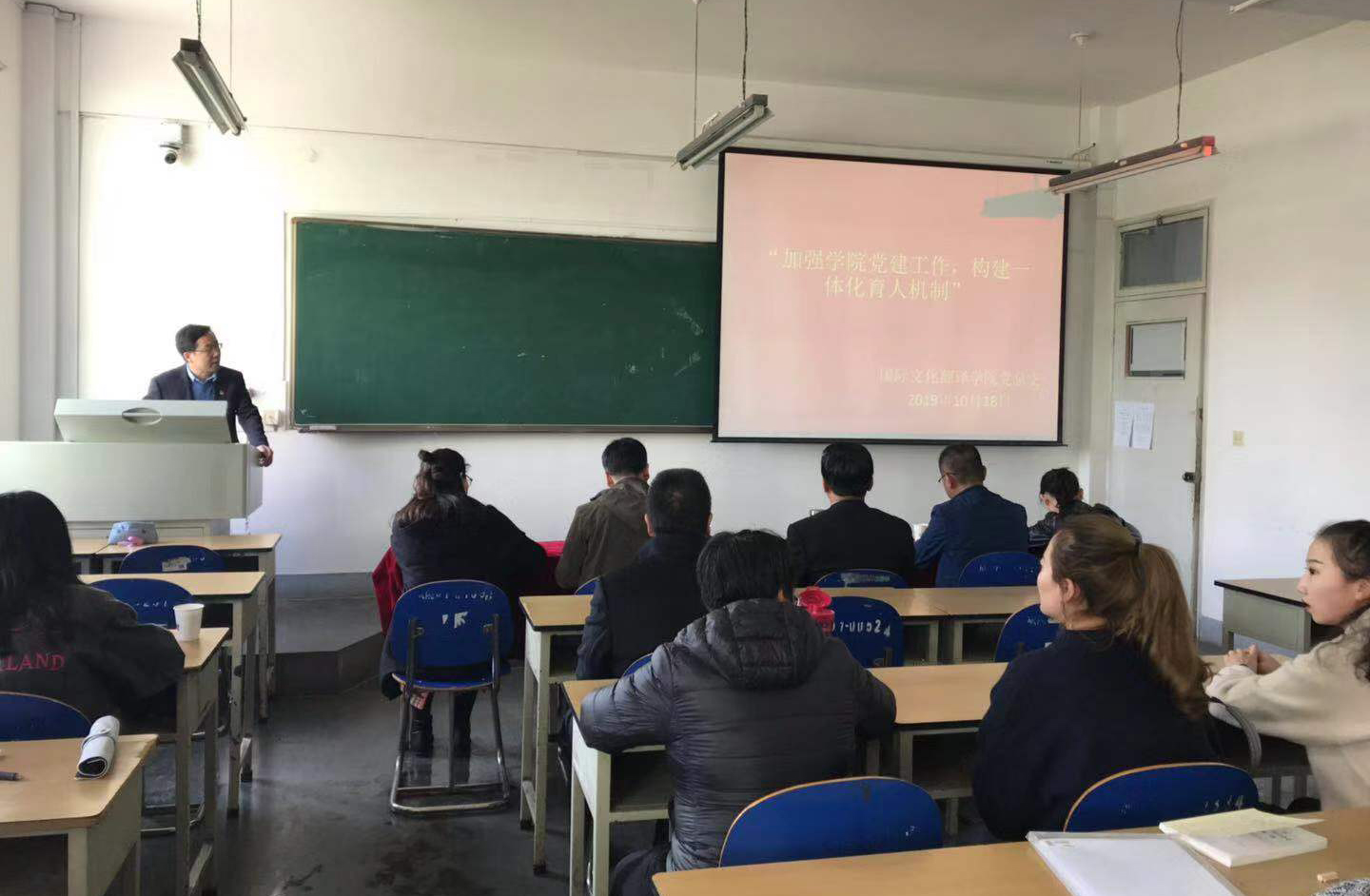 按照学校“不忘初心、牢记使命”主题教育领导小组安排,10月18日中午,国际文化翻译学院党总支书记周彦新为全院师生党员作了题为“加强学院党建工作,构建一体化育人体系”的主题教育专题党课。学校第五指导组成员王晓平、晏立强、王聪到会指导。
