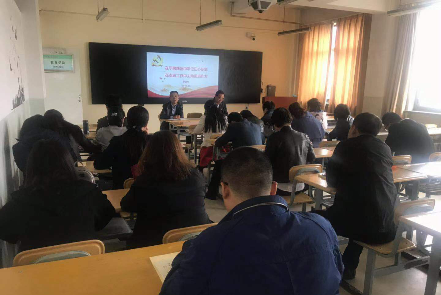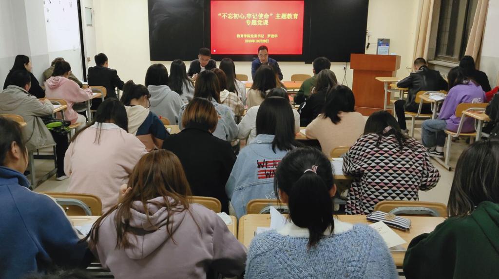 按照 “不忘初心、牢记使命”主题教育要求,经学校第五巡回指导组同意,10月20日,教育学院党委书记罗进华作了题为“在学思践悟中牢记初心使命,在学习工作中主动担当作为”的主题教育专题党课。学院处级干部、党支部书记、全体师生党员参加党课。