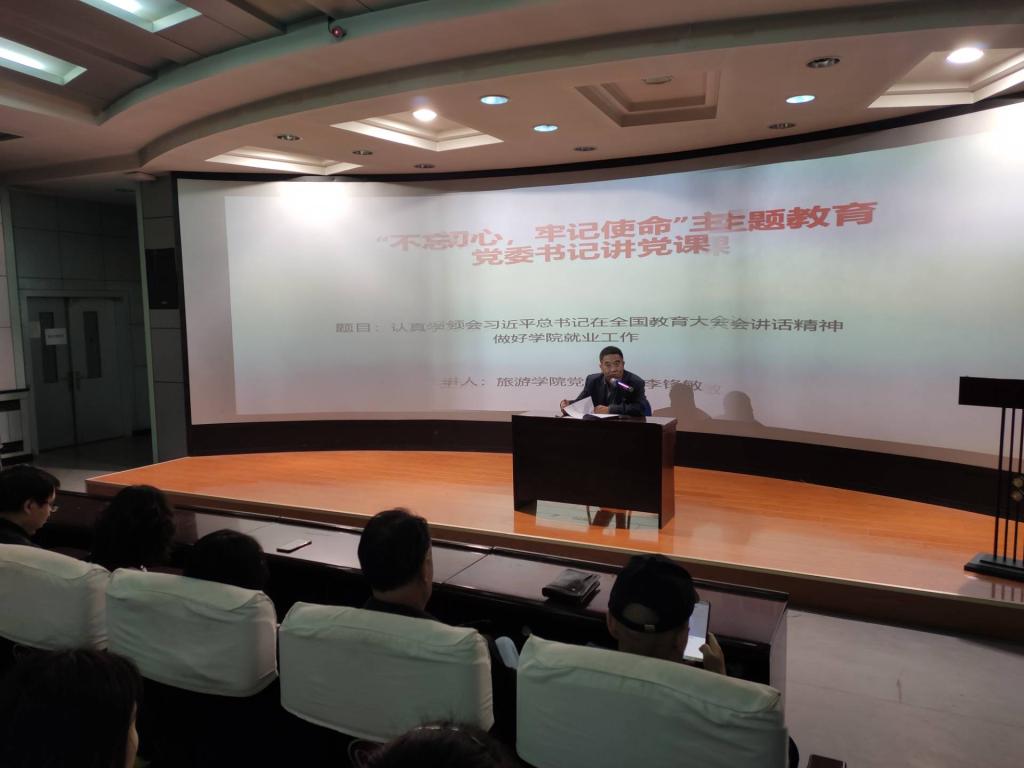 根据学校党委“不忘初心、牢记使命”主题教育工作安排,10月23日下午,在综合楼导游实训模拟室,旅游学院党委书记李锋敏同志以《认真学习习近平总书记在全国教育工作大会上的讲话,推进学院就业工作迈向新台阶》为题,为学院全体师生党员上了一场生动而有意义的党课。