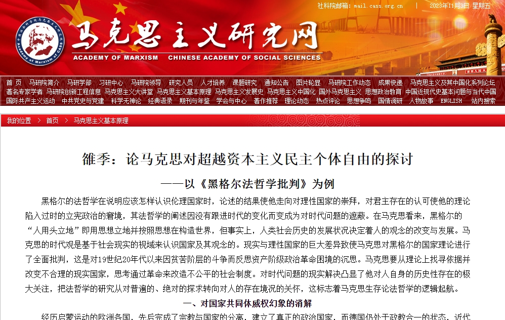 近日,beat365马克思主义基本原理教研室副教授雒季的学术论文《论马克思对超越资本主义民主个体自由的探讨——以<黑格尔法哲学批判>为例》被马克思主义研究网全文转载。