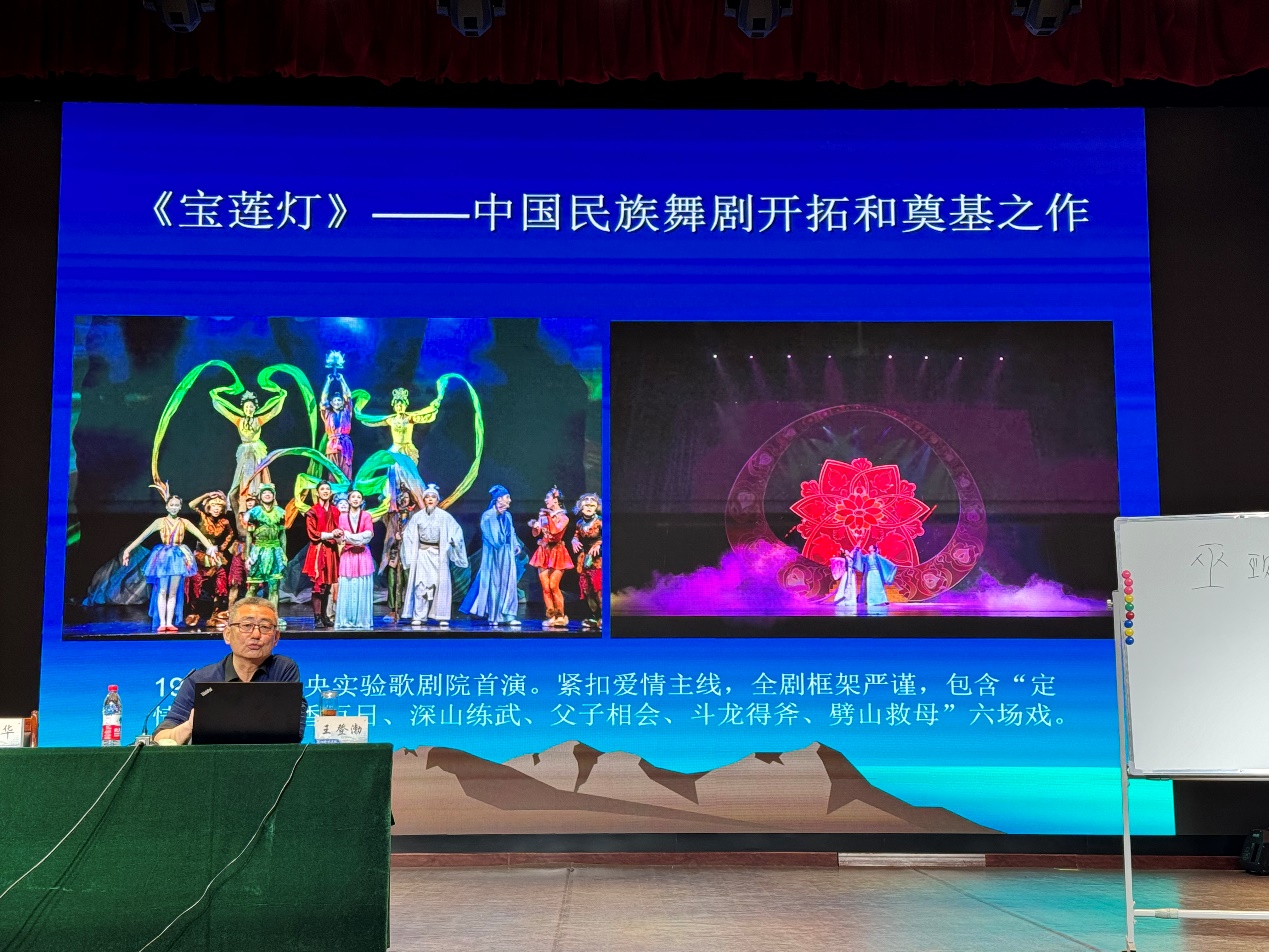 王登渤作了题为《舞剧创作中的若干元素问题解析》报告。讲座以翔实的资料、深入的分析、生动的讲解,纵横跨越中国舞剧七十年的发展历程,从中国民族舞剧开拓之作《宝莲灯》到近年来涌现出的《只此青绿》《咏春》等优秀舞剧作品进行精辟解读,集中凝练讲解了舞剧构成要素、创作思想及艺术成就。
