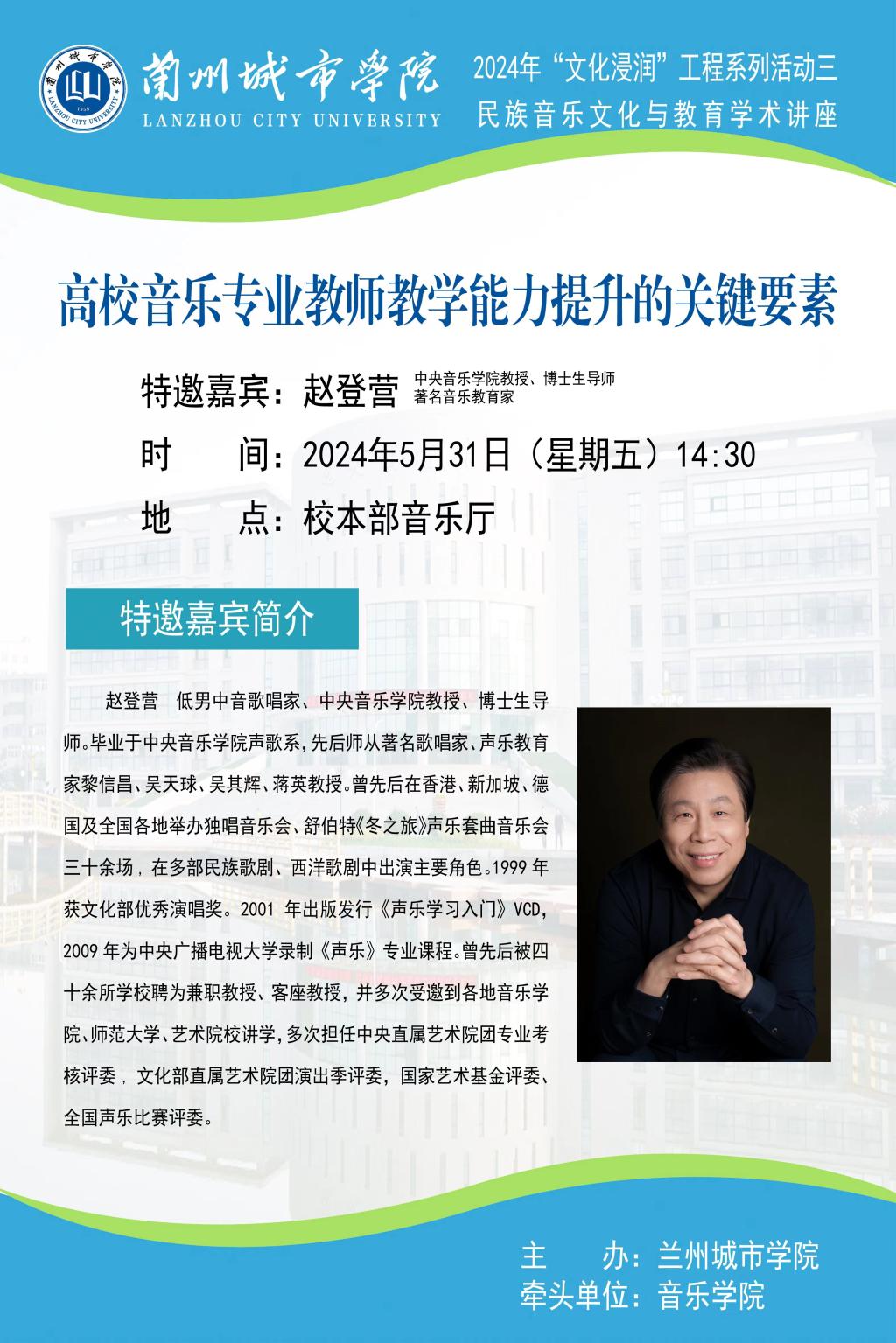 应科学技术处、甘肃省民族音乐研究中心和音乐学院联合邀请,中央音乐学院教授赵登营将来beat365作学术报告。具体事宜公告如下: