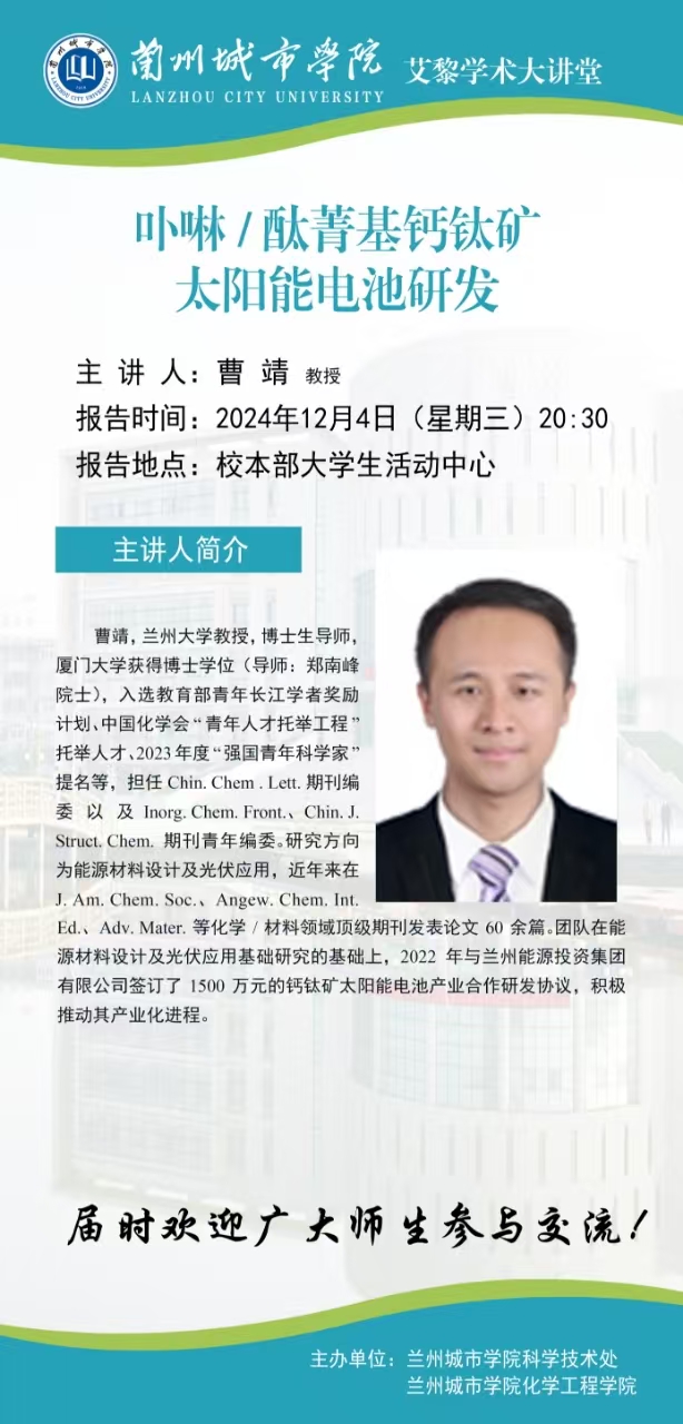 曹靖,兰州大学教授,博士生导师,厦门大学获得博士学位(导师:郑南峰院士),入选教育部青年长江学者奖励计划、中国化学会“青年人才托举工程”托举人才、2023年度“强国青年科学家”提名等,担任Chin. Chem. Lett.期刊编委以及Inorg. Chem. Front.、Chin. J. Struct. Chem.期刊青年编委。研究方向为能源材料设计及光伏应用,近年来在J. Am. Chem. Soc.、Angew. Chem. Int. Ed.、Adv. Mater.等化学/材料领域顶级期刊发表论文60余篇。团队在能源材料设计及光伏应用基础研究的基础上,2022年与兰州能源投资集团有限公司签订了1500万元的钙钛矿太阳能电池产业合作研发协议,积极推动其产业化进程。