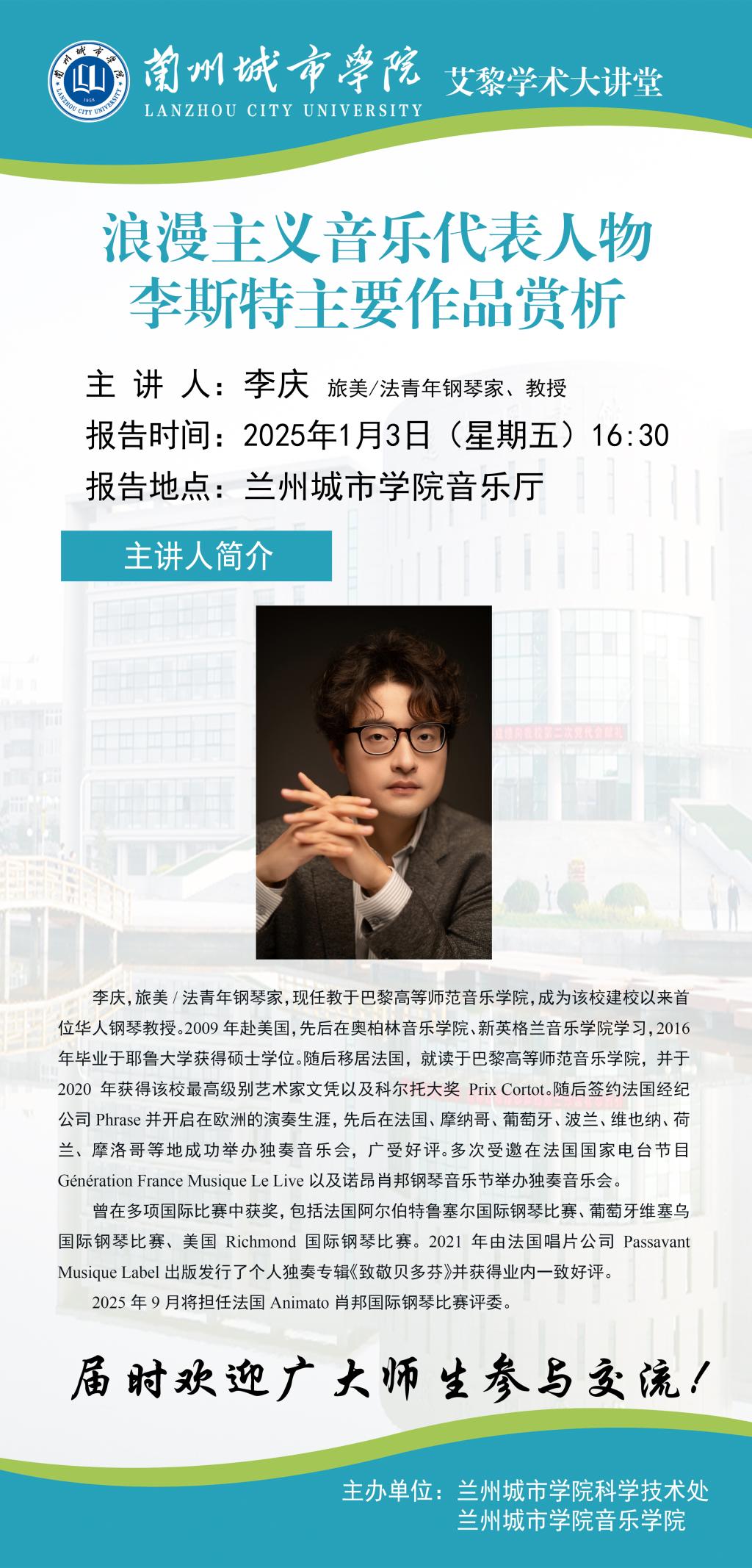 应科学技术处和音乐学院联合邀请,旅美/法青年钢琴家李庆教授将来beat365作学术报告。具体事宜公告如下: