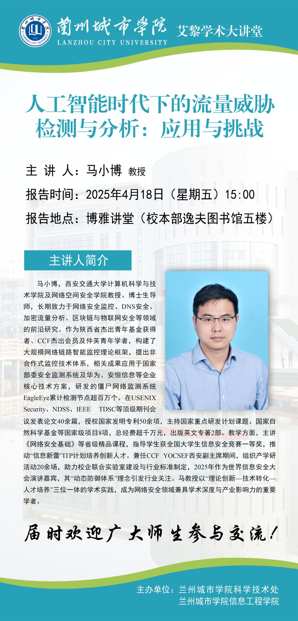 马小博,西安交通大学计算机科学与技术学院及网络空间安全学院教授、博士生导师,长期致力于网络安全监控、DNS安全、加密流量分析、区块链与物联网安全等领域的前沿研究。作为陕西省杰出青年基金获得者、CCF杰出会员及仲英青年学者,构建了大规模网络链路智能监控理论框架,提出非合作式监控技术体系,相关成果应用于国家部委安全监测系统及华为、安恒信息等企业核心技术方案,研发的僵尸网络监测系统EagleEye累计检测节点超百万个。在USENIX Security、NDSS、IEEE TDSC等顶级期刊会议发表论文40余篇,授权国家发明专利50余项,主持国家重点研发计划课题、国家自然科学基金等国家级项目8项,总经费超千万元,出版英文专著2部。教学方面,主讲《网络安全基础》等省级精品课程,指导学生获全国大学生信息安全竞赛一等奖,推动“信息新蕾”ITP计划培养创新人才。兼任CCF YOCSEF西安副主席期间,组织产学研活动20余场,助力校企联合实验室建设与行业标准制定,2025年作为世界信息安全大会演讲嘉宾,其“动态防御体系”理念引发行业关注。马教授以“理论创新—技术转化—人才培养”三位一体的学术实践,成为网络安全领域兼具学术深度与产业影响力的重要学者。