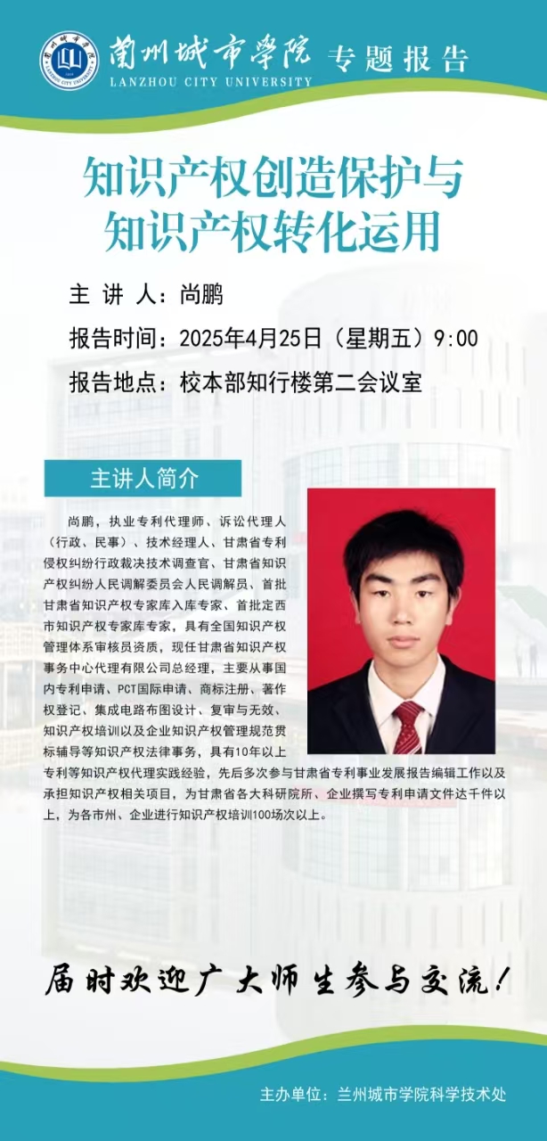 应科学技术处邀请,甘肃省知识产权事务中心代理有限公司尚鹏总经理将来beat365作专题报告。具体事宜公告如下: