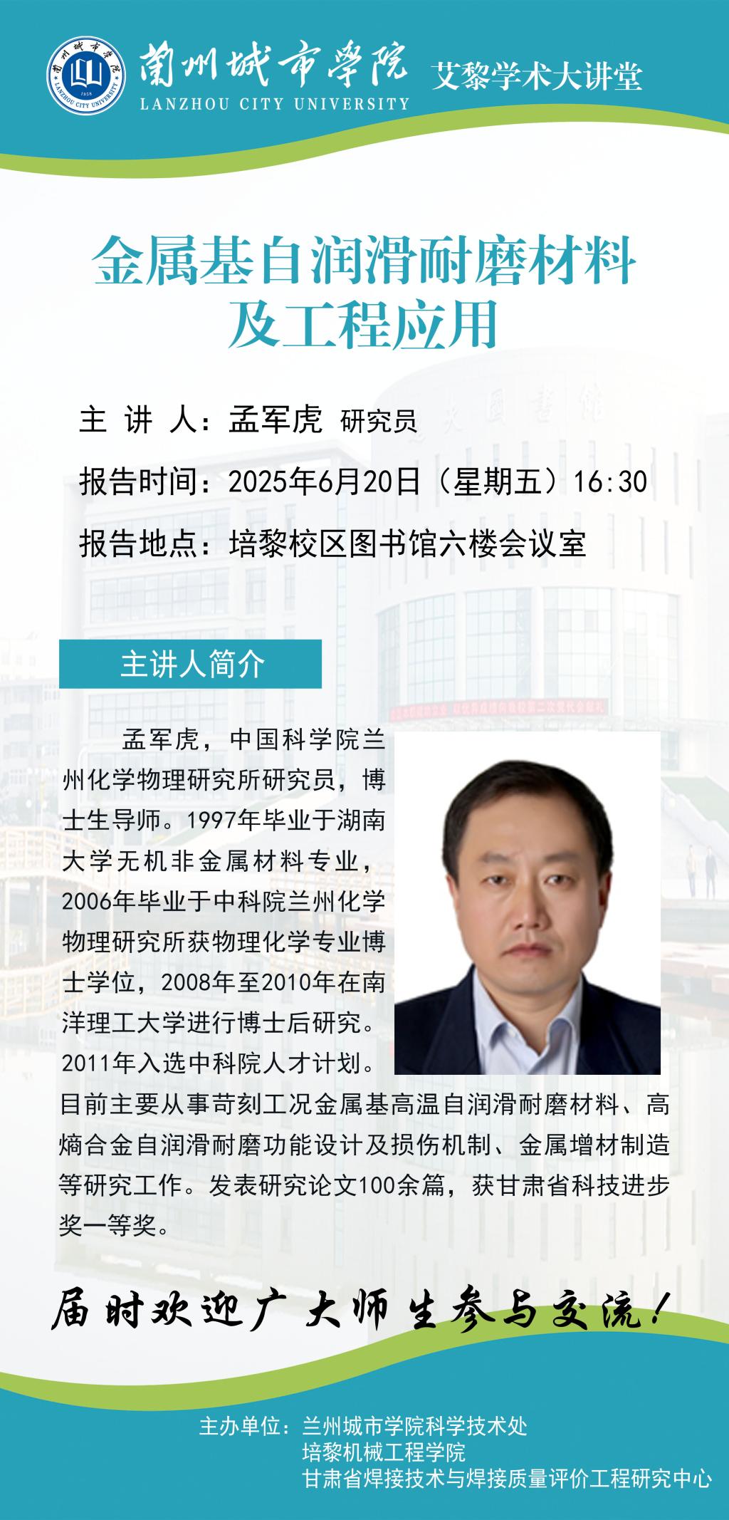 应科学技术处、培黎机械工程学院和甘肃省焊接技术与焊接质量评价工程研究中心联合邀请,中国科学院兰州化学物理研究所孟军虎研究员将来beat365作学术报告。具体事宜公告如下: