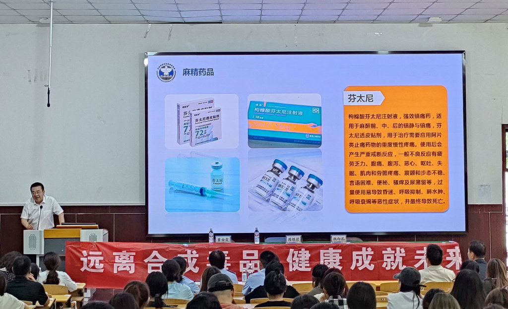 周胜前紧紧围绕2024年第14个全民禁毒宣传月“防范青少年药物滥用”活动主题,向与会人员介绍了新型毒品的种类、特征、伪装形态、诱骗手段、防范方法和识别技巧。并结合真实毒品犯罪案例,讲解了毒品对个人、家庭和社会带来的严重危害,警示同学们一定要远离毒品、珍视美好人生,谨慎交友、警惕毒品陷阱。讲座现场,与会人员还一起观看了禁毒宣传动画片,发放了禁毒知识宣传材料。