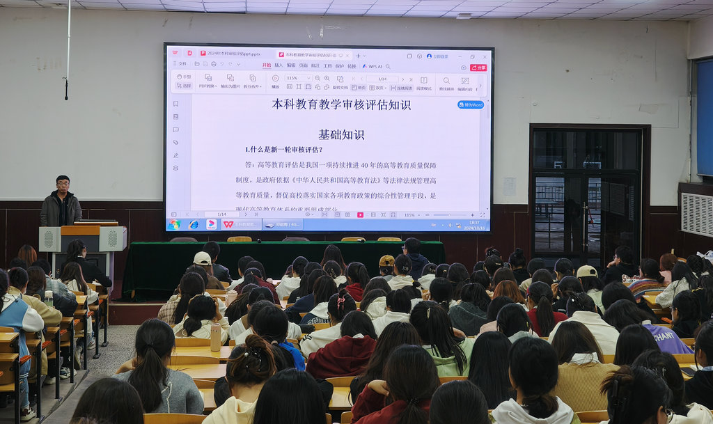 学院党委负责人从审核评估的重要性、审核评估的指标与内涵、审核评估应知应会知识及同学们如何积极参与迎评工作等四个方面进行深入讲解。党委负责人强调,审核评估是对学校立德树人成效、教育教学水平、人才培养质量、整体办学实力的全面检验,意义重大,关乎发展。每一位同学都要以主人翁姿态主动参与,从现在做起,以实际行动助力迎评工作顺利进行。