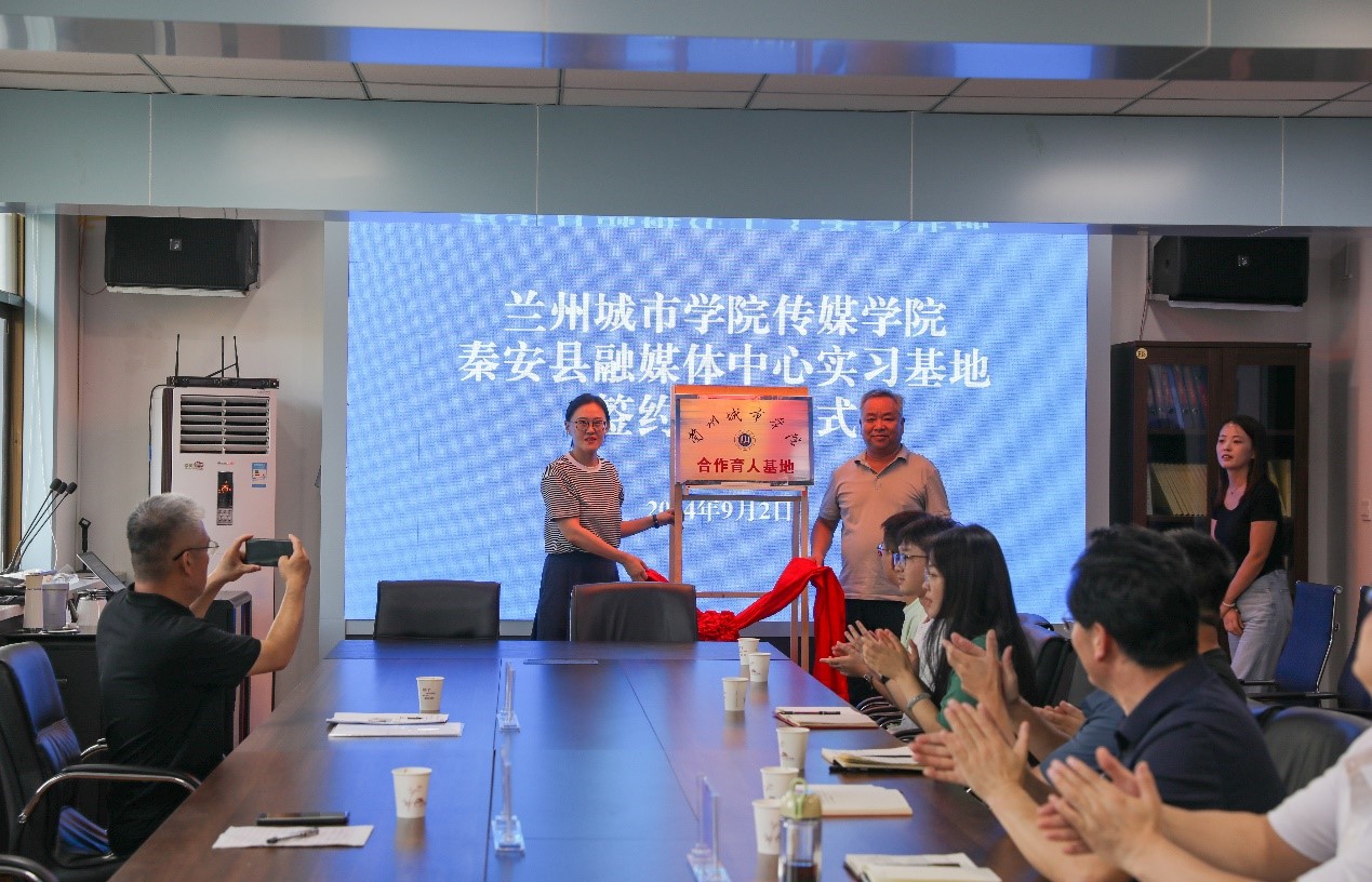 9月2日下午,在秦安县融媒体中心,双方举行了合作育人基地建设签约揭牌仪式。秦安县委常委、宣传部长马昊莹及县融媒体中心班子成员、相关部室负责人和传媒学院相关领导、实习生参加了揭牌仪式。仪式上,双方介绍了各自相关情况,签订了合作育人基地建设协议,马昊莹和学院党委负责人共同为合作育人基地揭牌。