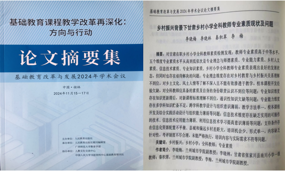 由李晓梅、李梅等提交的论文“乡村振兴背景下甘肃乡村全科教师专业素质现状及问题”入选本次会议论文摘要集。该论文是甘肃哲学社会科学项目阶段性成果,聚焦乡村小学全科教师专业素质发展,也是对甘肃教育改革实践现况的反映,通过此次交流,后续将持续修改完善,投稿发表。