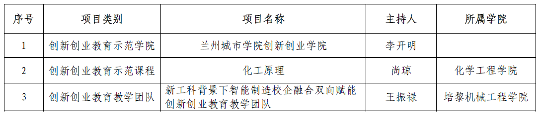 甘肃省创新创业教育改革项目中,获批省级创新创业教育示范学院1个,创新创业教育示范课程1门,创新创业教育教学团队1个。