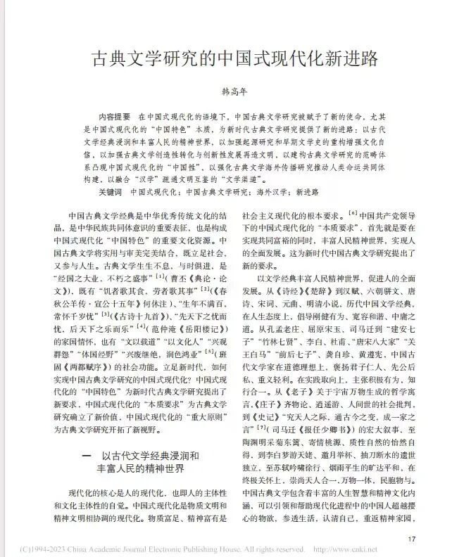 学术价值和主要贡献:就学术层面而言,该文在一定程度上突破了传统古典文学研究的固有框架,致力于探索古典文学研究的新理论体系,开辟了古典文学研究的中国式现代化新进路。从实践层面来看,该文倡导通过中国古典文学研究增强文化自信、推动文化传承、促进文明互鉴,为构建中国特色文学研究学科体系、学术体系、话语体系提供了新思路,对提升国民文化素养、增强文化自信以及推动中华文化国际传播具有重要意义。