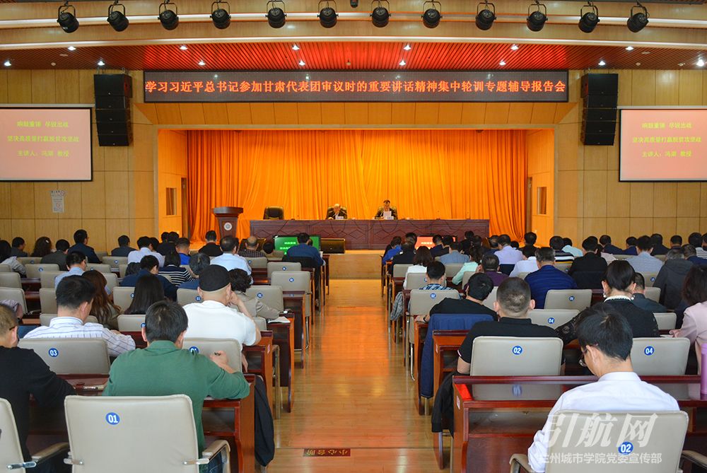 4月23日,学校在逸夫图书馆六楼国际会议中心召开学习习近平总书记参加甘肃代表团审议时的重要讲话精神集中轮训专题辅导报告会。中共甘肃省委党校常务副校长冯湖应邀作了题为《响鼓重锤 尽锐出战 坚决高质量打赢脱贫攻坚战》的辅导报告。校党委书记陈晓龙主持会议,在家校领导、全体处级干部、正科级党员干部一百多人参加会议并听取报告。