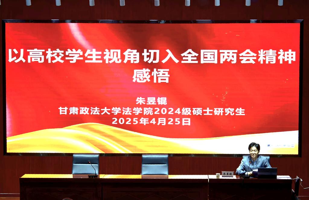 为全面深入学习领会习近平总书记在全国两会期间发表的系列重要讲话精神和全国两会通过的报告和文件精神,按照省委教育工委统一部署,4月25日下午,学校举办“理响校园·培根铸魂”全国两会精神示范性宣讲活动。兰州交通大学马克思主义学院蔡中宏教授、甘肃政法大学法学院2024级硕士研究生朱昱锟应邀做宣讲报告。会议由党委宣传部负责人主持。